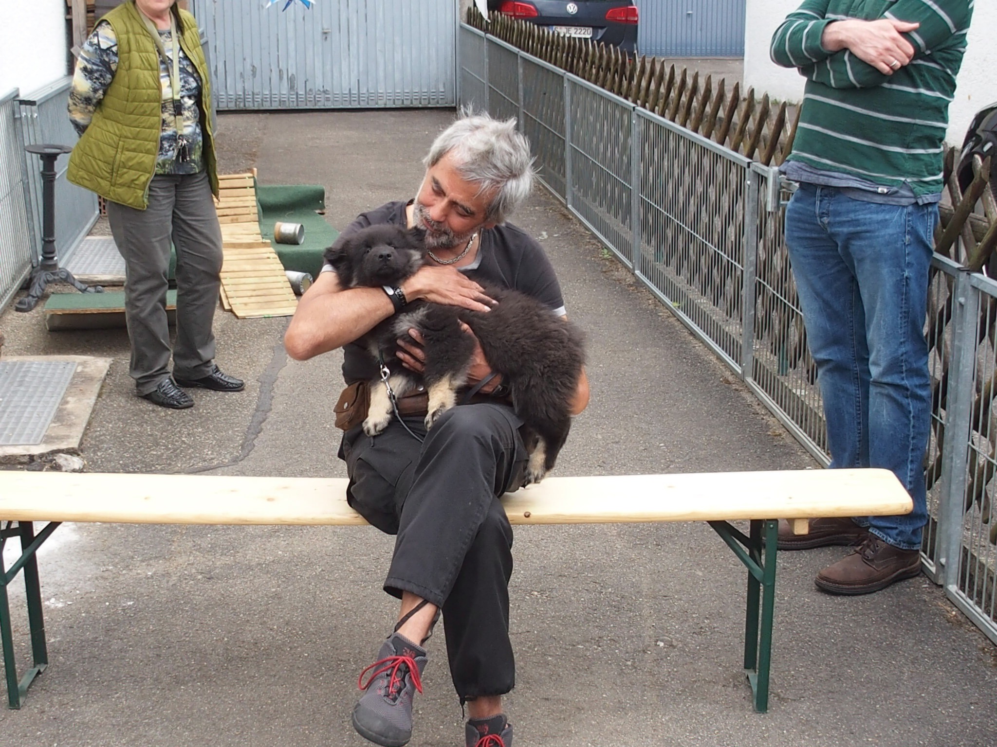 Vor der ersehnten Übergabe nach dem gemeinsamen Mittagessen gab es aber erst die obligatorische Einweisung durch eine Zuchtanwärterin (Namen leider vergessen), die bei dieser Gelegenheit ihre Prüfung ablegen konnte. Sie machte es richtig gut und locker. Ich hätte gerne eine Tonaufnahme gemacht, um den gut vorgetragenen, umfangreichen Stoff zu Hause noch einmal anhören zu können oder diesen auch anderen Hundebesitzern … ;-)Anwesend waren auch die Zuchtwarte Karin Vorbeck und Dr.Cornelia Burk