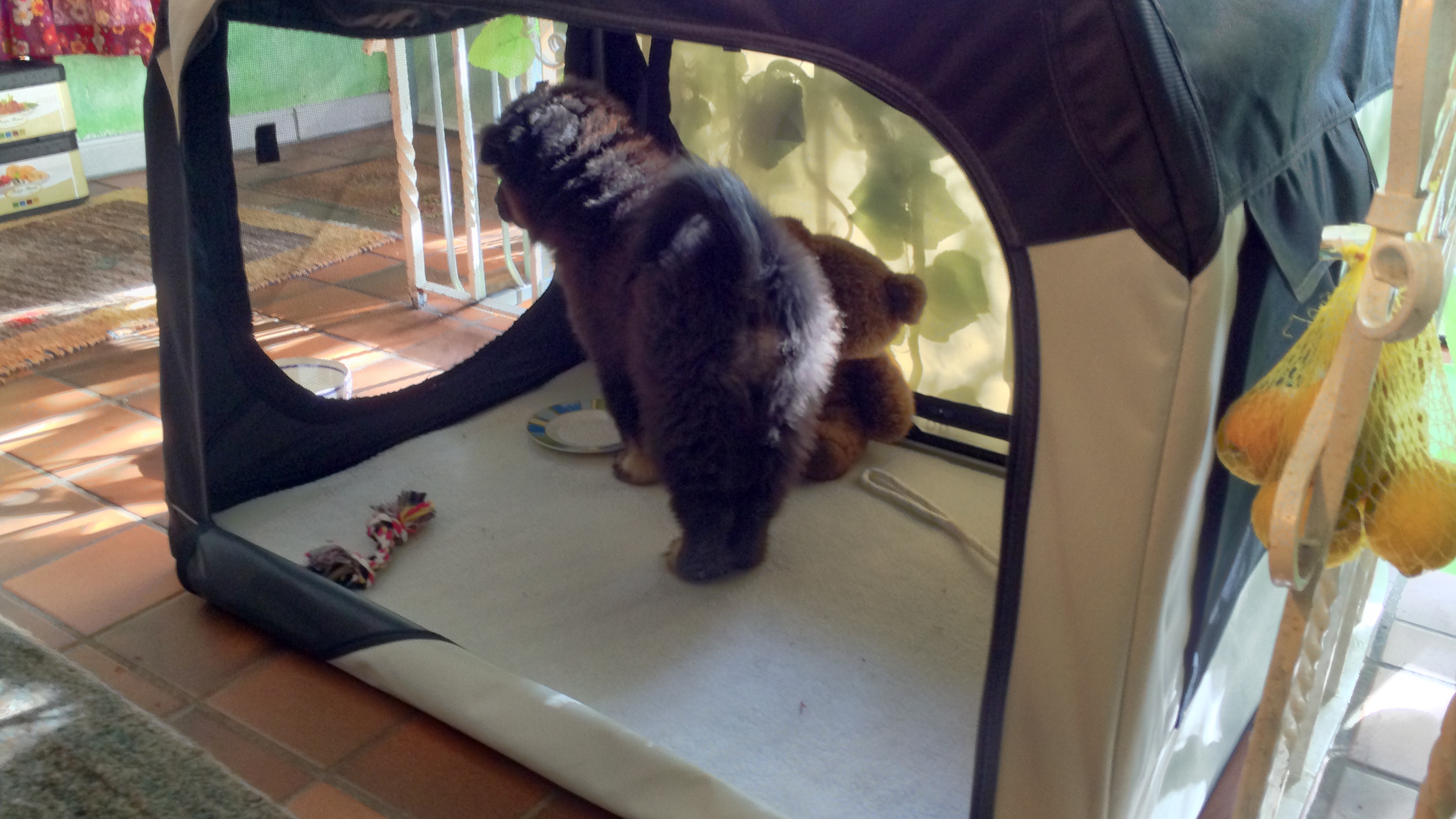 Seine neue „Höhle“ (Schlafplatz) ist ihm wohl derzeit noch etwas zu groß; er schläft lieber vor meinem Behelfsbett im Erdgeschoss, zumindest so lange, wie ich nachts mit ihm raus muss (ca 4:00)